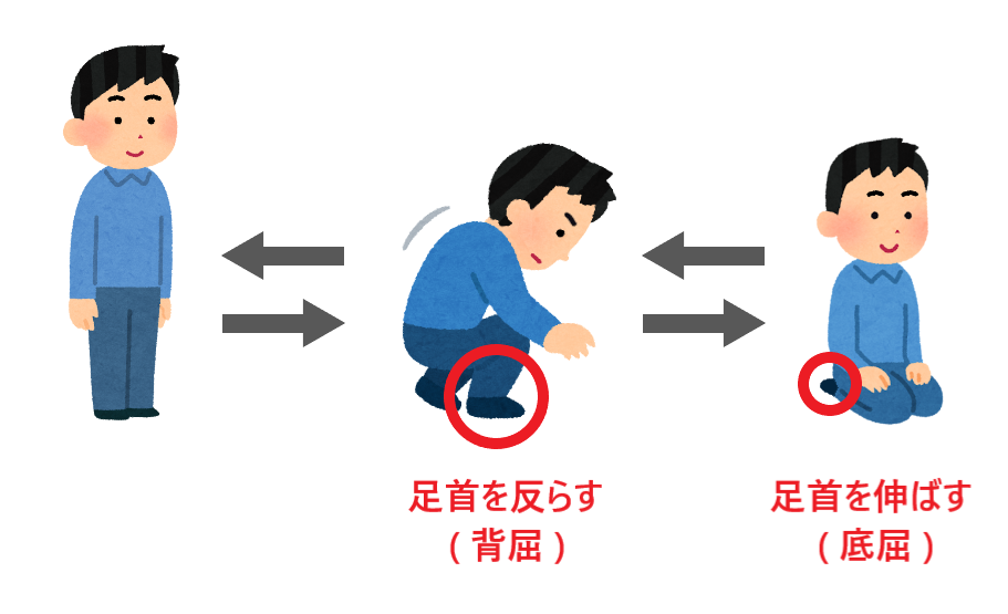 正座をするためにしゃがむ・正座の状態から立ち上がる時は、両足首もしくは左右どちらかの足首は必ず反らします(背屈)。そして、正座をすると両足首は必ず伸ばします(底屈)。