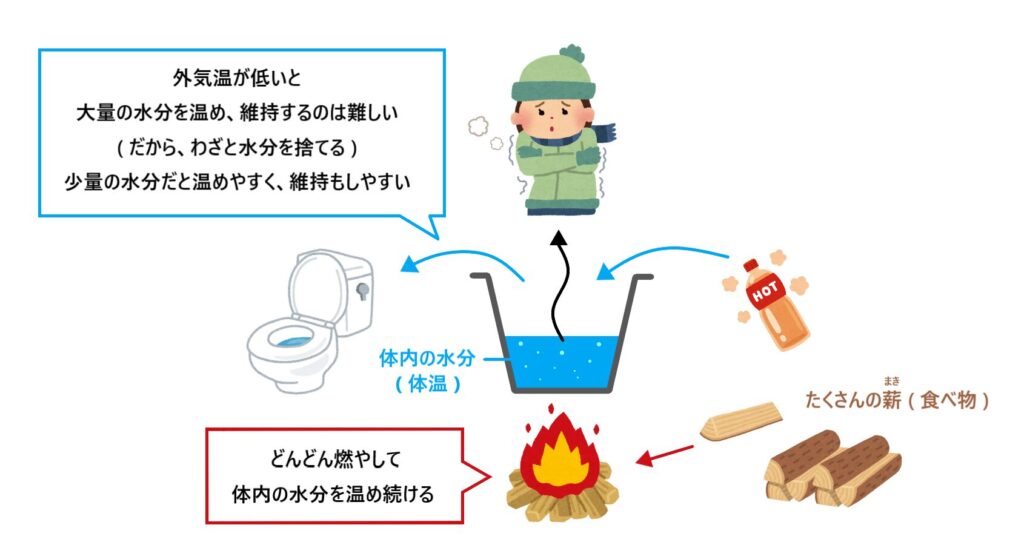 ではなぜ、お手洗いが近くなるのかというと、体内の水分量を減らして(食事による発熱で)温めた方が体内の水温(体温)を一定に維持しやすいからです。