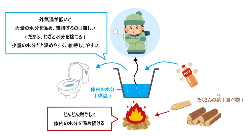 ではなぜ、お手洗いが近くなるのかというと、体内の水分量を減らして(食事による熱量で)温めた方が体内の水温(体温)を一定に維持しやすいからです。