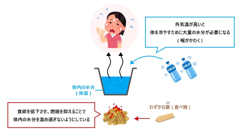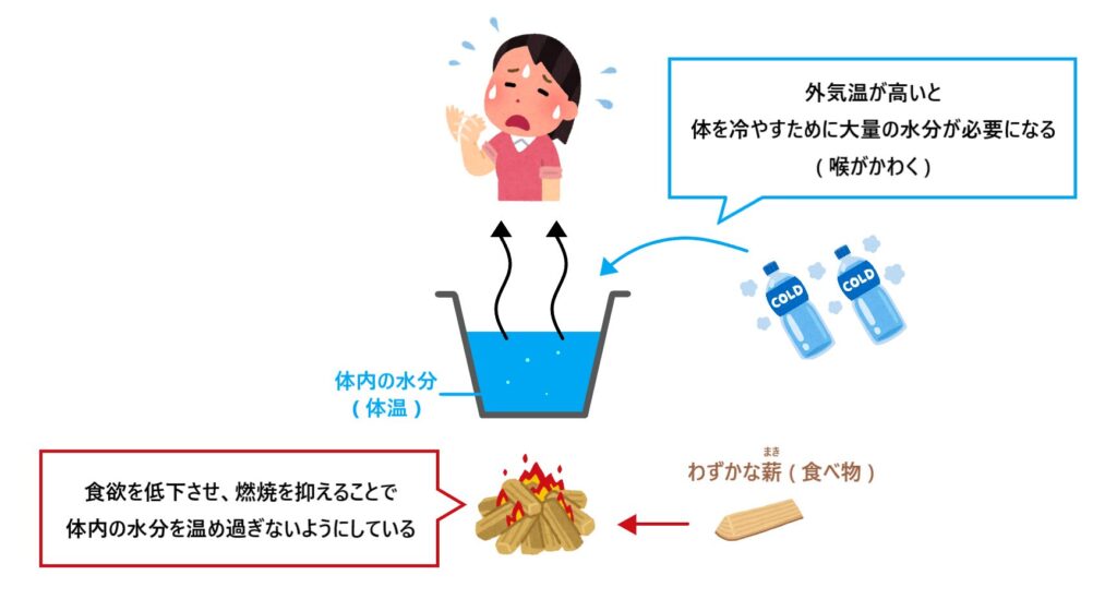 体内の水温(体温)を上げるのは「食事」です。食べる量が増えれば増えるほど、体内で発生する熱量は多くなり、その熱量で体内の水分が温まります。そのため、暑い時はわざと食欲をなくして、なるべく体内の水温が上がらないように体が調節しているのです。