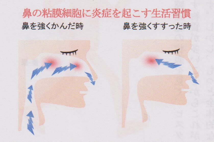これらの行為は一見、鼻がきれいになるので良いように思われますが、実はこの習慣(癖)を毎日何度も何度も繰り返すと花粉症を悪化させる原因となります。