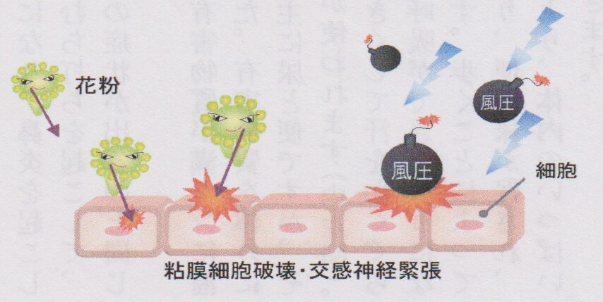 鼻粘膜についた花粉(=異物)を取り除くために、生体はまず「くしゃみ」で追い出そうとします。花粉が飛び始めた頃、よくくしゃみが出るのはそのためです。