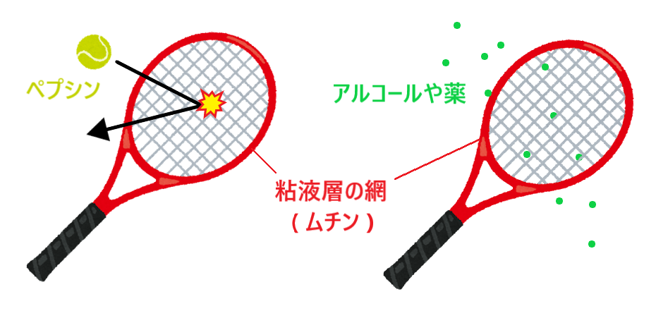 テニスボールであるペプシンは、ラケットの網に当たると当然はじき返されてしまいます。しかし、小さな木の実であるアルコールや薬は難なくラケットの網目をすり抜けてしまいます。