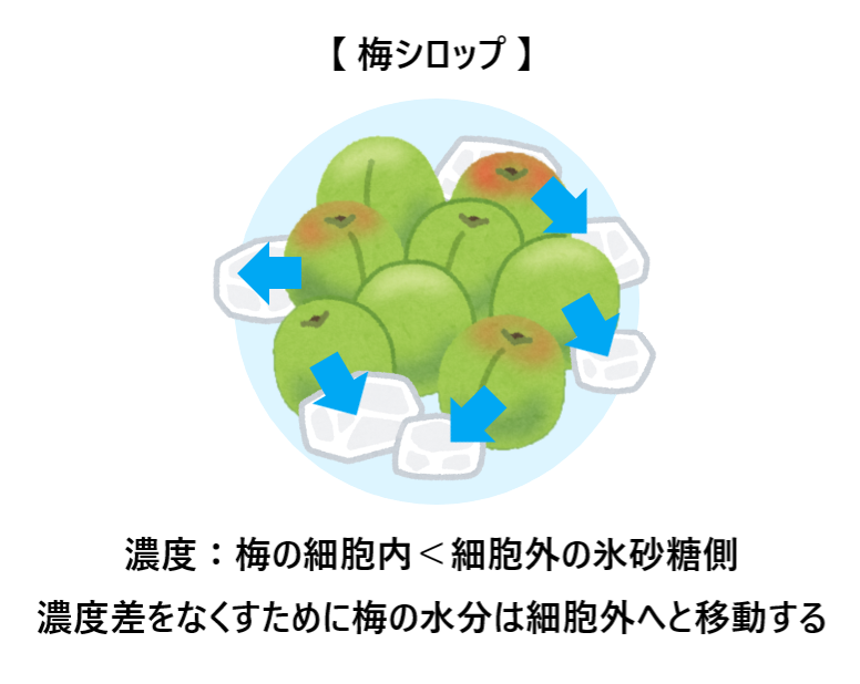 浸透圧とは、お砂糖と食べ物との間で濃度差があり、なおかつ半透膜(水は通すがお砂糖は通さない膜)を隔てて隣接していると、濃度を一定に保つために水が移動する現象のことです。梅シロップの場合、半透膜とは梅の皮のことです。