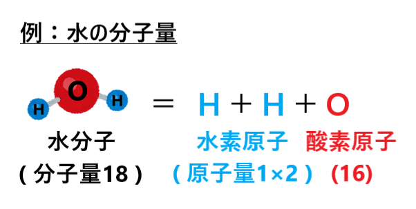 例えば、水の分子量(重さ)は18です。水分子を構成している水素原子2個と酸素原子1個の原子量(重さ)を合計すると18になるからです。