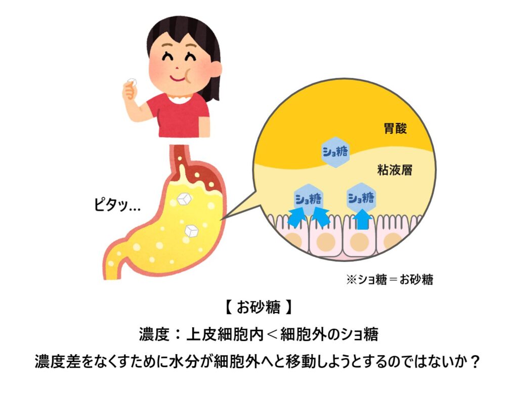 お砂糖(ショ糖)を摂取すると胃の活動が止まるのは、お砂糖と胃の表面の細胞(上皮細胞)との間に浸透圧差があるからではないかと私は考えます。要するに、お砂糖が胃の表面の細胞(上皮細胞)に到達すると浸透圧のせいで細胞を介して水分が引っ張り出されそうになっているのではないかという考察です。